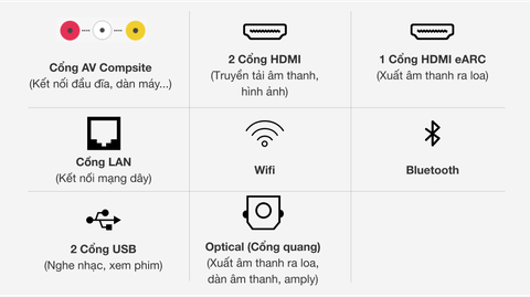 Tính năng Airplay 2 tích hợp cho dòng điện thoại iPhone, điện thoại hoạt động trên hệ điều hành Android thì sử dụng Screen Mirroring để chia sẻ hình ảnh, tài liệu, phim lên màn hình lớn của tivi.