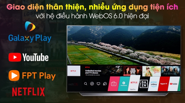 Giao diện gọn gàng, thân thiện WebOS 6.0 sở hữu kho ứng dụng phong phú đáp ứng đa dạng nhu cầu giải trí trong gia đình, bao gồm các ứng dụng phổ biến như: Netflix, Youtube, POPS Kids, Clip Tv, Spotify